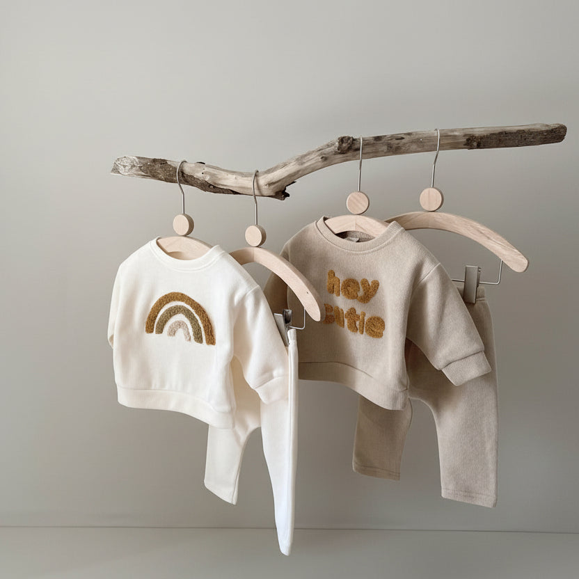De sweater heeft een ronde halslijn en comfortabele pasvorm, terwijl het broekje een elastische band heeft voor makkelijk aan- en uittrekken. Beide kledingstukken zijn gemaakt van zacht katoen dat aangenaam aanvoelt op de kinderhuid. De neutrale kleuren maken de set makkelijk te combineren.